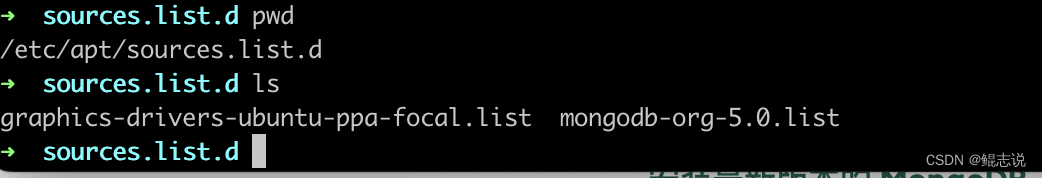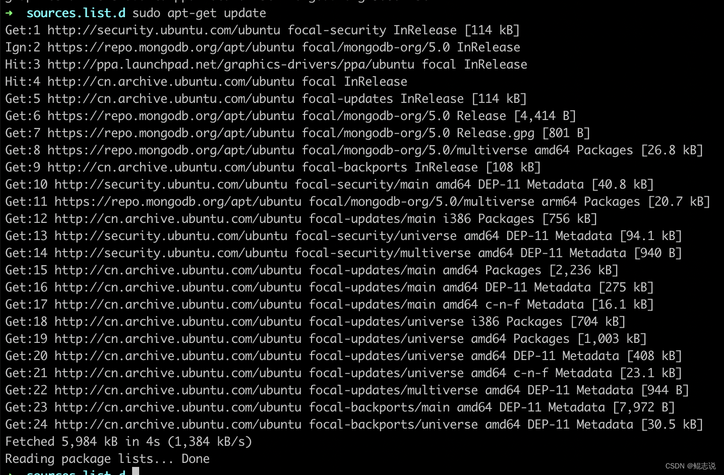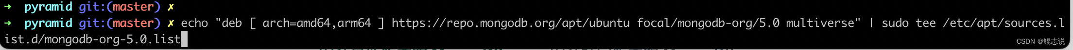 echo "deb [ arch=amd64,arm64 ] https://repo.mongodb.org/apt/ubuntu focal/mongodb-org/5.0 multiverse" | sudo tee /etc/apt/sources.list.d/mongodb-org-5.0.list我的是Ubuntu 20.04版本