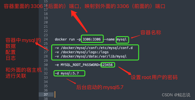 docker run -p 3306:3306 --name mysql -v /docker/mysql/conf:/etc/mysql/conf.d -v /docker/mysql/logs:/logs -v /docker/mysql/data:/var/lib/mysql -e MYSQL_ROOT_PASSWORD=123456 -d mysql:5.7