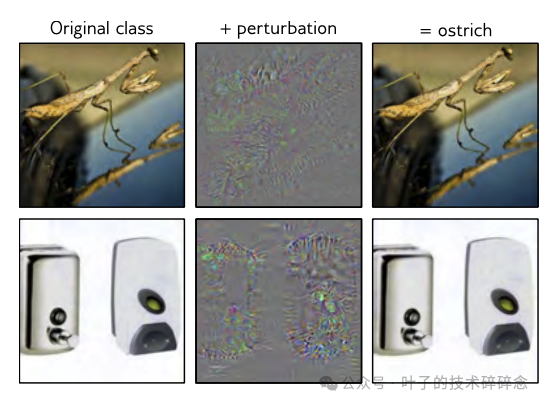 图 20.14 对抗样本。在每个例子中,左侧图像被 AlexNet 正确分类。通过考虑网络输出对输入的梯度,可以找到一个小的扰动(中间图,为了可见性放大了 10 倍),这个扰动加到原始图像(右侧)上时,会使网络错误地将其分类为鸵鸟。这是尽管原始图像和扰动图像对人类来说几乎无法区分的情况下。改编自 Szegedy et al. (2014)。
