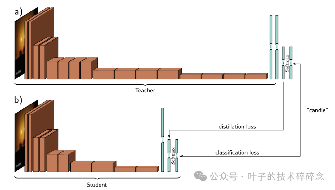 图 20.16 知识蒸馏。a) 教师网络用于图像分类,按照常规方法进行训练,采用多类交叉熵作为分类损失。b) 学生网络则使用相同的损失进行训练,并额外增加了蒸馏损失,该损失鼓励学生网络在 softmax 操作前的激活值与教师网络的相同。