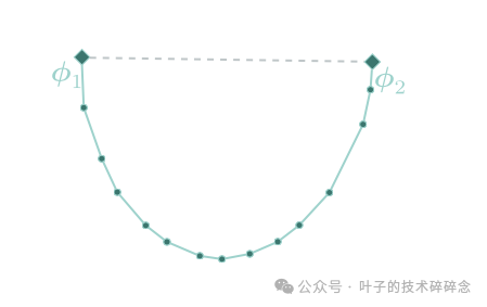 图 20.7 极小值之间的连接。对 CIFAR-10 上 DenseNet 的损失函数进行切片分析。参数 φ1 和 φ2 代表两个独立发现的极小值。这些参数之间的线性插值展示了一个能量障碍(虚线所示)。但是,在足够深且宽的网络中,能够在两个极小值间找到一条低能量的曲线路径(显示为青色线)。改编自 Draxler et al. (2018)。