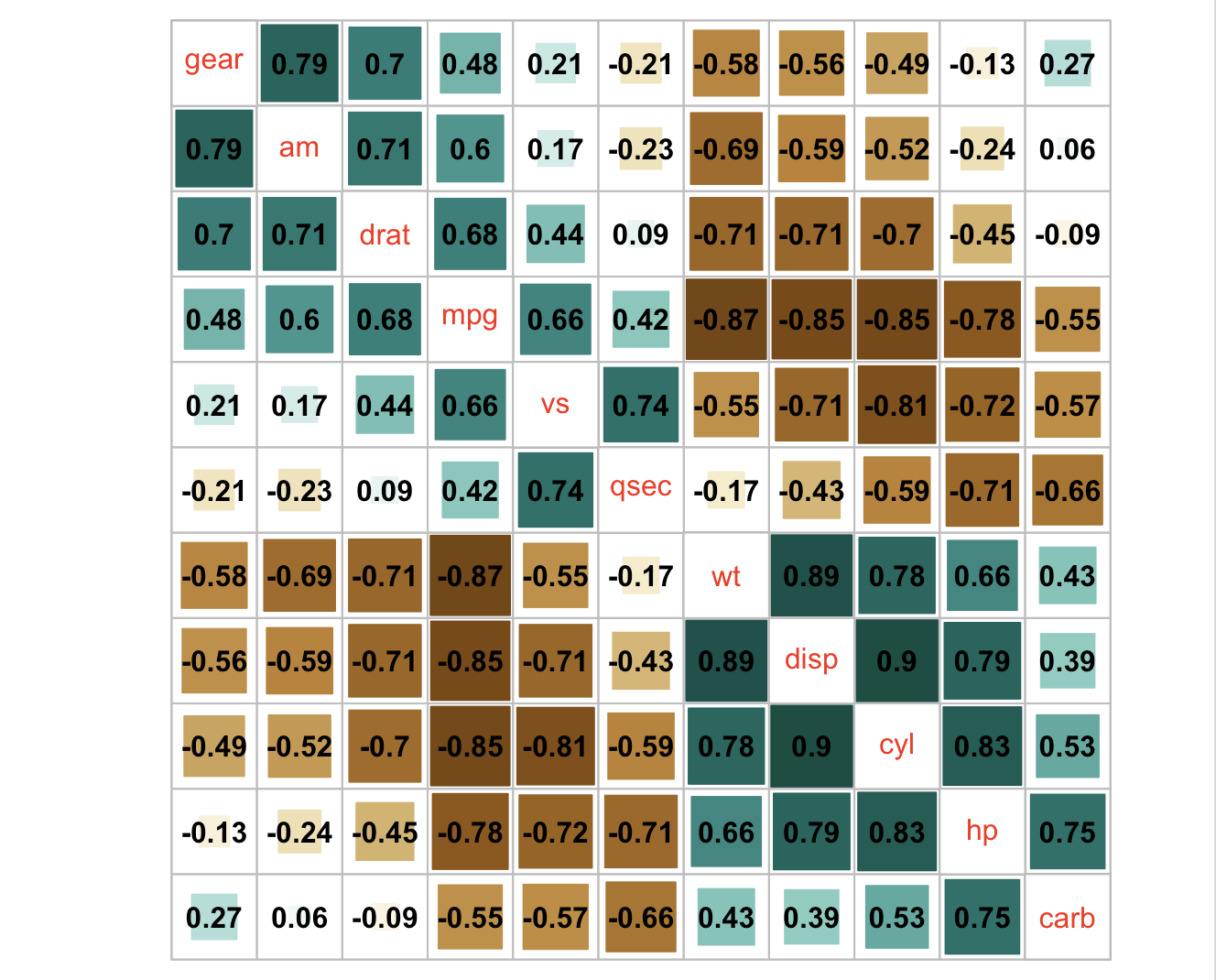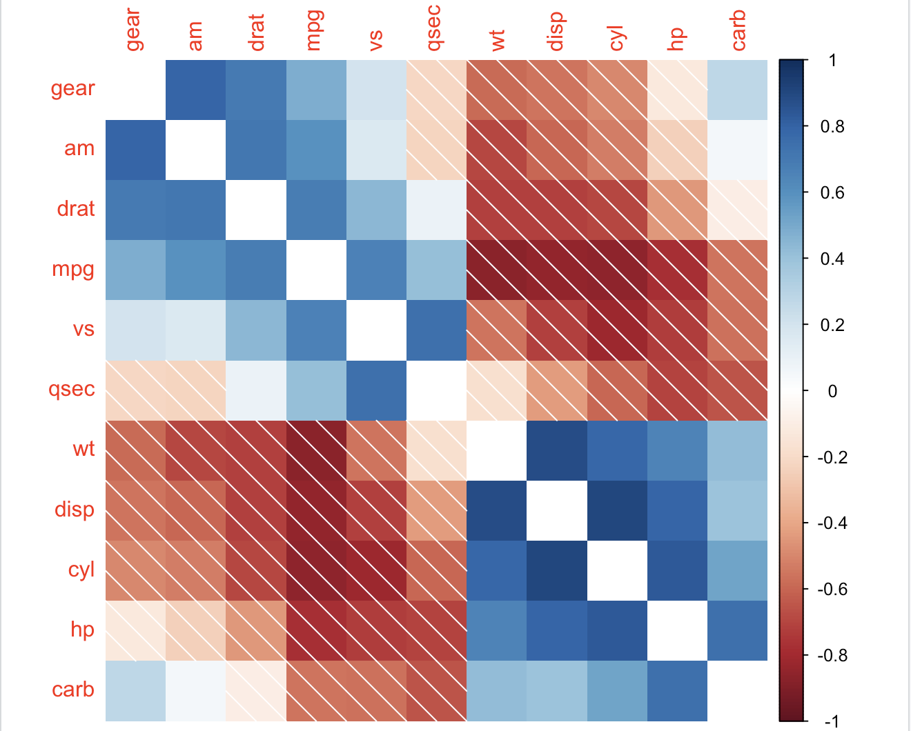 :仅显示矩阵的下三角部分相关矩阵可以根据相关系数进行重新排序。这种重排序对于识别矩阵中隐藏的结构和模式非常重要。