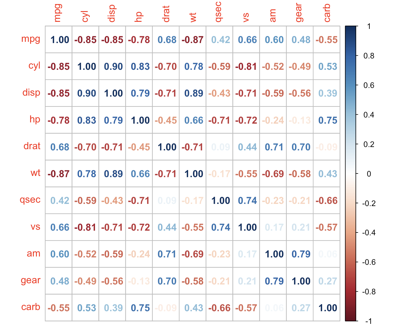 # cyl -0.8521620 1.0000000 0.9020329 0.8324475 -0.6999381 0.7824958 -0.59124207 -0.8108118