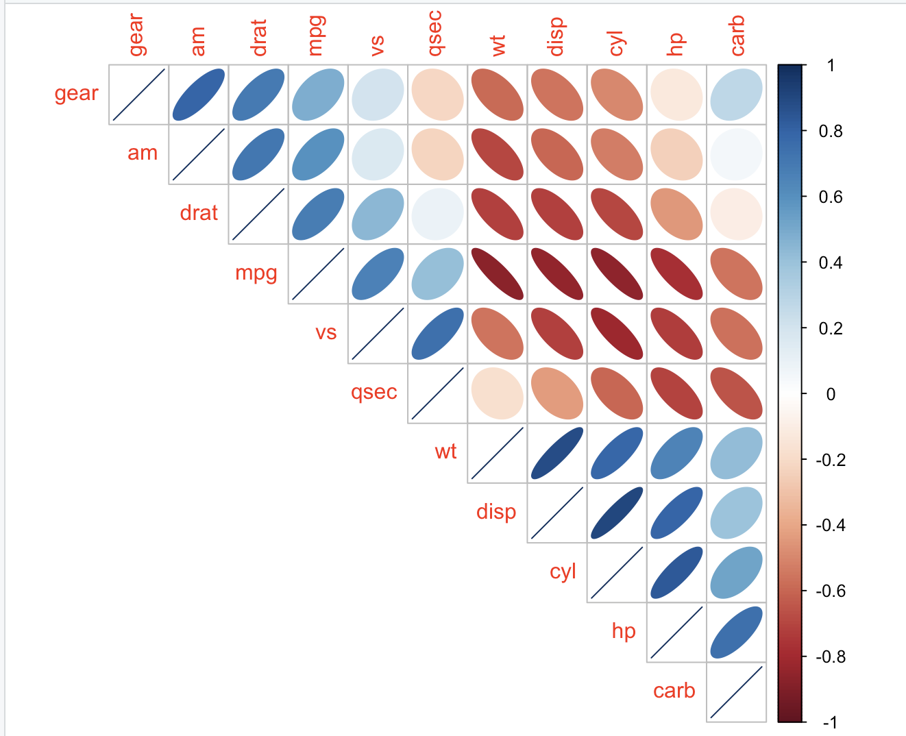 corrplot(M, method = 'ellipse', order = 'AOE', type = 'upper')