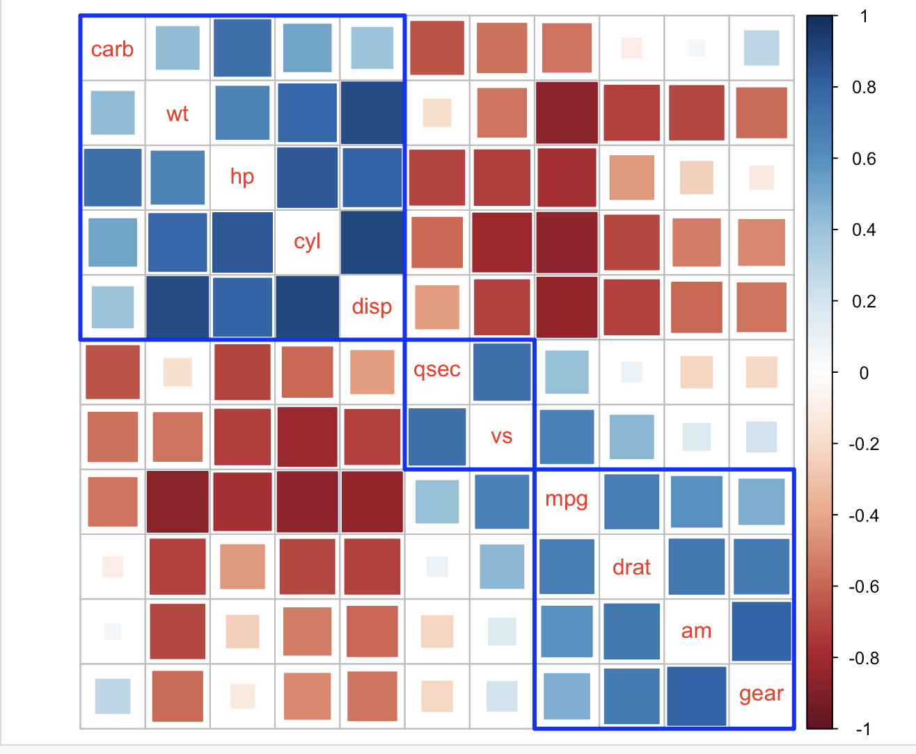 corrplot(M, method = 'square', diag = FALSE, order = 'hclust',