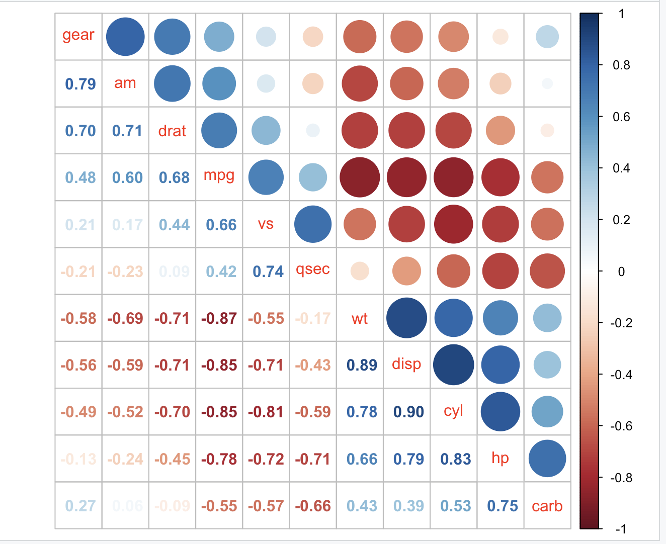 ,但负相关系数会被阴影化(来自Michael Friendly的工作)。corrplot.mixed()
