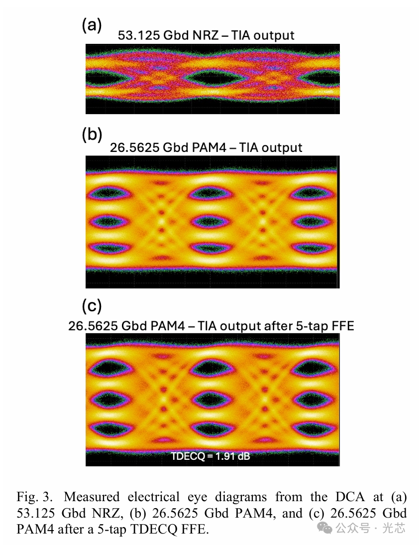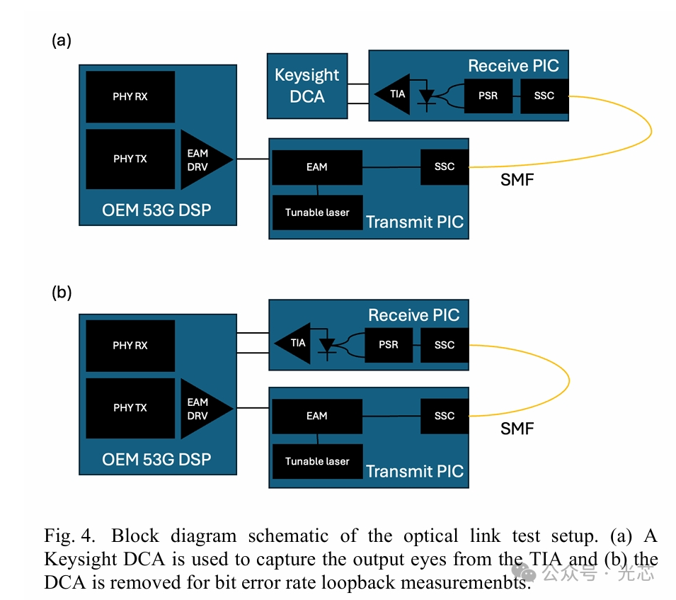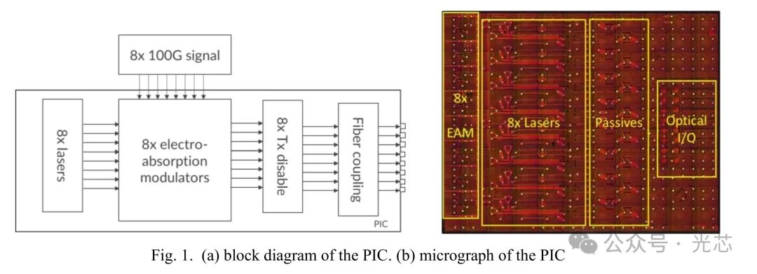 【简述】通过异质集成+光电集成工艺,展示了异质集成Tunable laser和EAM的发射机,并采用了集成DRV、光电协同设计的oDSP芯片,接收机是45nm CMOS工艺单片集成的PD和TIA的光电芯片。光纤耦合采用V Groove处理,演示了一个53Gbps的完整光链路。