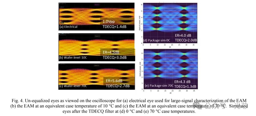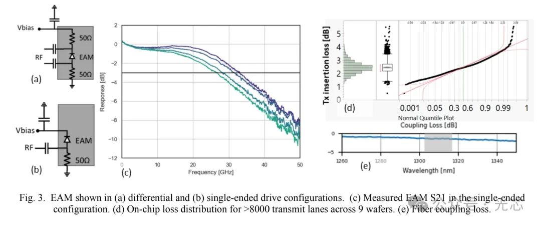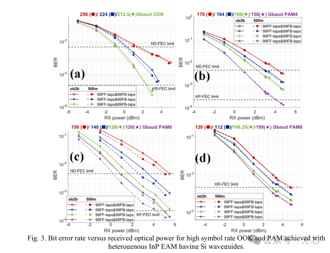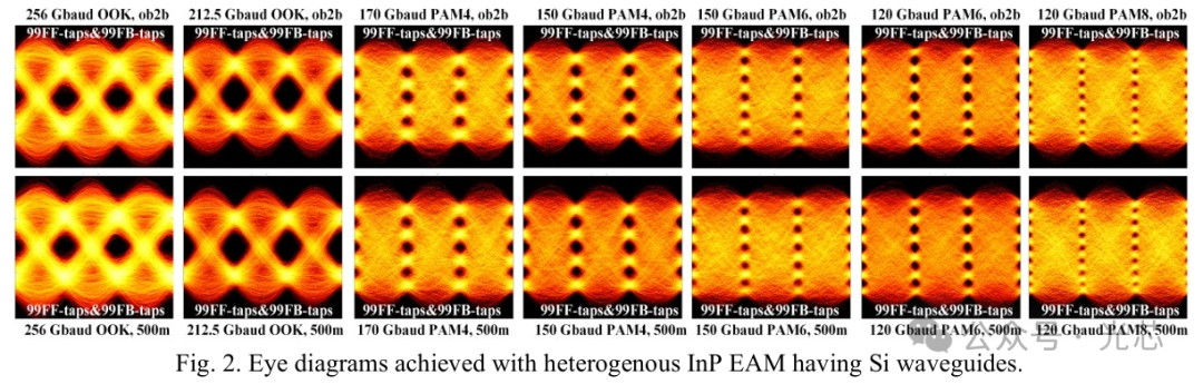 【简述】这个工作应该就是1.6T PASIC的核心器件了,通过集成片上电阻、电感,跟电容结合产生带宽peaking效应,升级了EAM的带宽,支持 256 Gbaud OOK, 170 Gbaud PAM4, 150 Gbaud PAM6, and 120 Gbaud PAM8的满足误码要求的500m单模光纤传输。