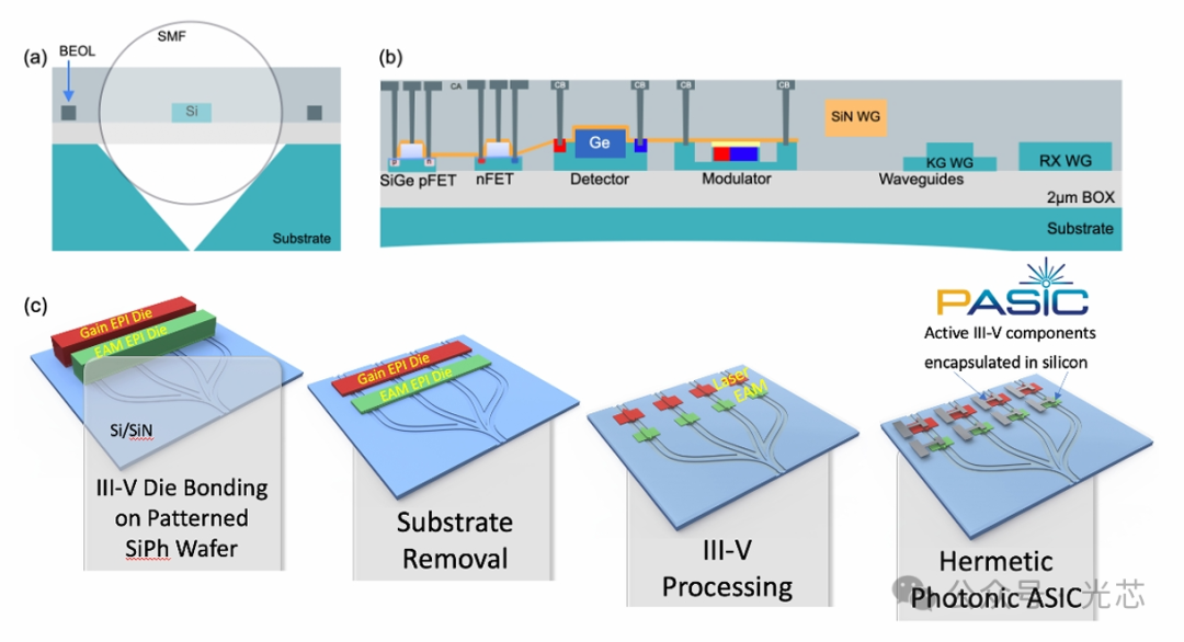 硅光wafer加工完之后,会进行III-V的die to wafer bonding,键合后对III-V的die进行衬底去除;衬底去除之后再进行III-V器件的加工(EAM DFB SOA等)。最后用硅的sealing cap盖住III-V器件进行局部气密。