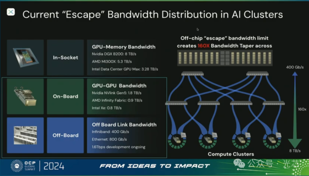 在一个Rack内,交换逃逸带宽的需求达到了1Pb/s。当前的AI集群,Socket内GPU和存储的带宽可以达到8Tb/s,板上GPU之间互联的带宽可以到1.8Tb/s,但板外的带宽就只有800Gb/s,1.6Tb/s光模块还在开发。从socket到板外,带宽是一个taper下降的趋势,有160倍以上的gap。