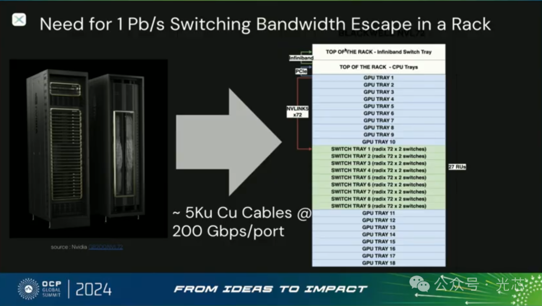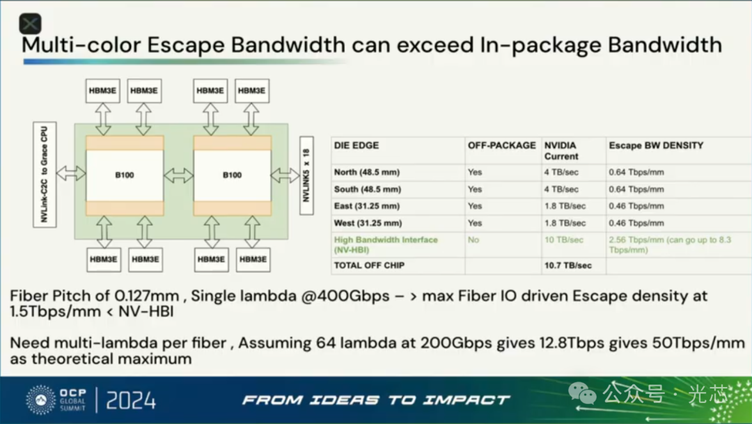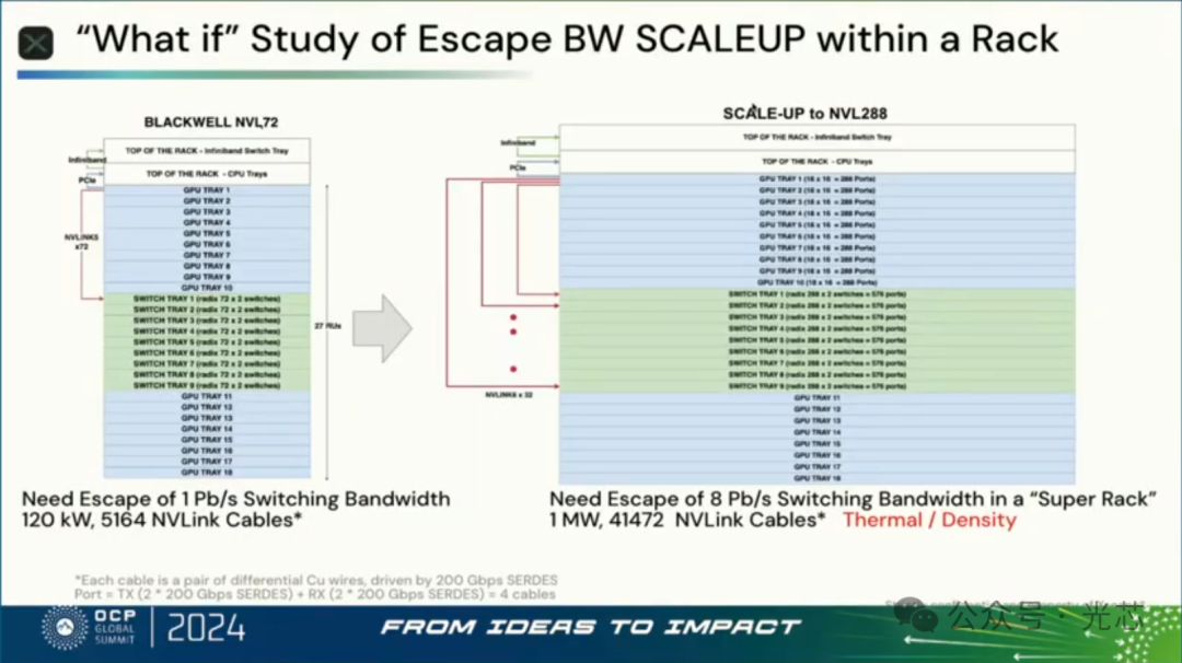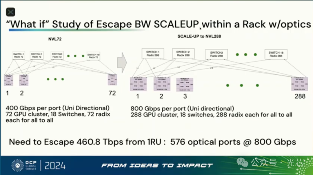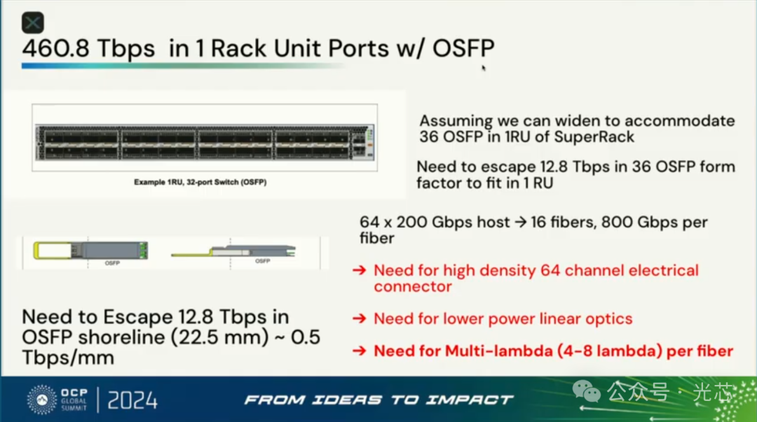 接下来分析了Rack内如果是Scaleup对光模块的需求,得出来的结论是1RU就需要576个800Gbps的端口才能够满足逃逸带宽,这是不可能实现的。如果还走可插拔模块方案,假设1RU可以插36个OSFP模块,那单个模块的容量也需要达到12.8Tbps的速率,那这时候就必须上波分+空分,比如通过16光纤×800Gbps是一种实现方案,一根光纤内要走4-8个波长。