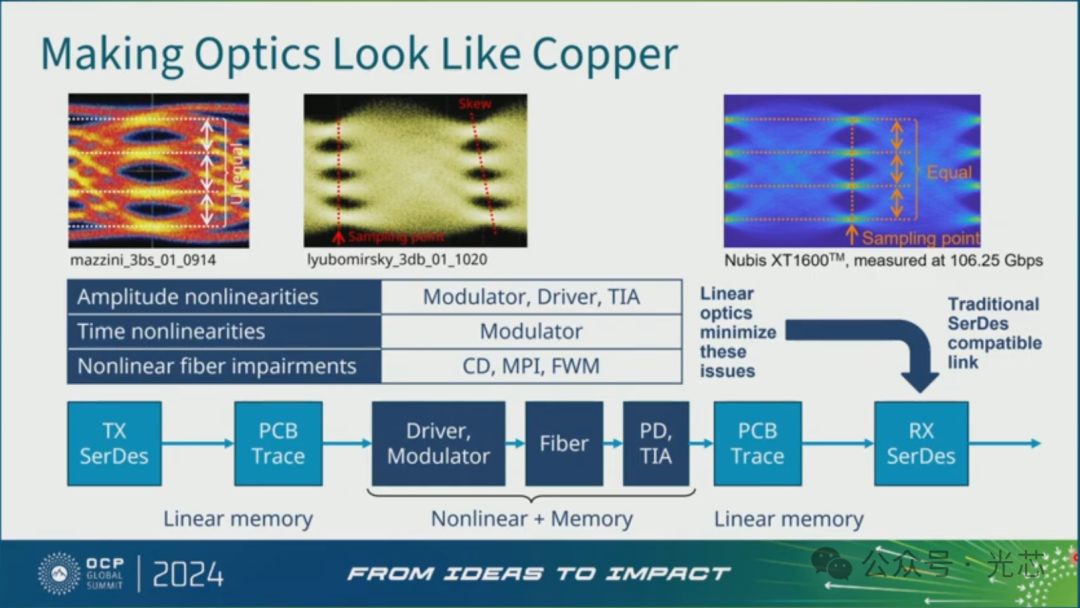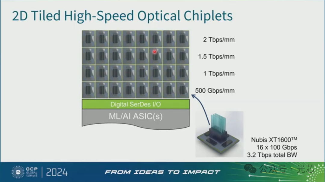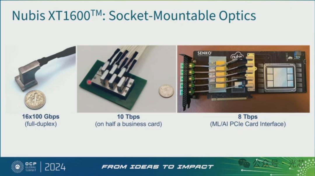 Nubis是一个做垂直耦合形态的CPO光引擎的公司,之前就发布了这款16×100Gbps的1.6T光引擎,主要是通过二维光纤阵列的耦合封装形态,做成一个高带宽密度的CPO光引擎,并且支持线性直驱LPO。通过CPO拉近的方式,实现Making optics look like copper的效果。