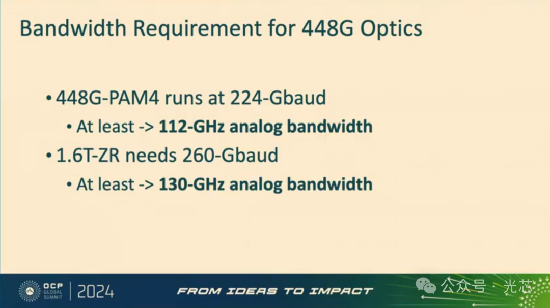对于448G PAM4速率,需要至少112 GHz的模拟带宽,而对于1.6T-ZR应用,则需要130 GHz模拟带宽。