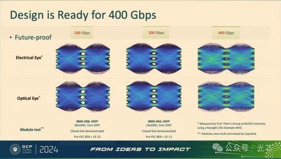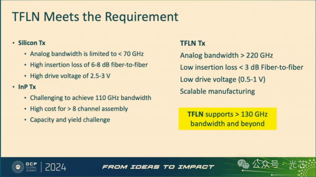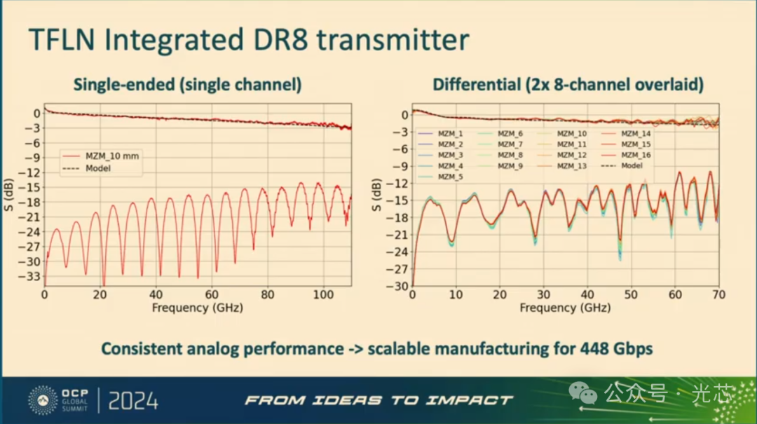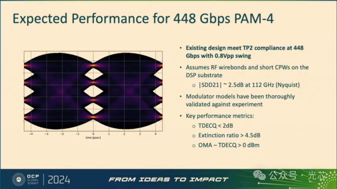 Hyperlight的CEO在OCP 2024介绍了铌酸锂在448G/lane时代的应用,分享了一些448G测试的数据。