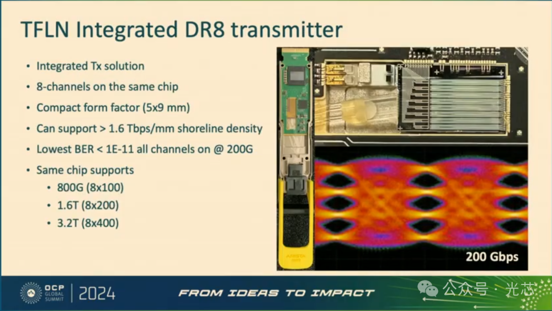 接下来展示了一个1.6T DR8的发射机,8通道用2个DFB,BER<1e-11,同一款光芯片可以从800G支持到3.2T。芯片的尺寸是5×9mm。单端驱动3dB带宽大约100GHz@10mm长MZM,差分驱动带宽>70 GHz。