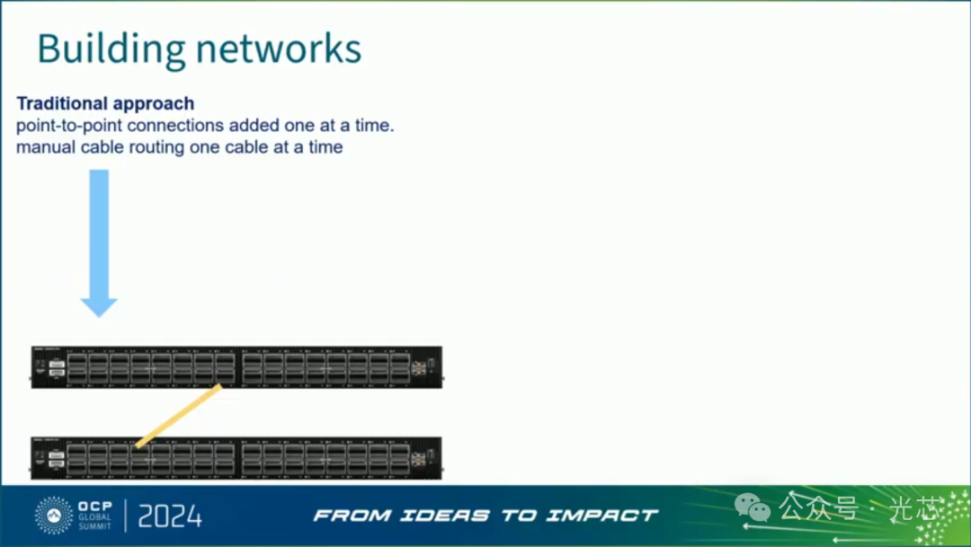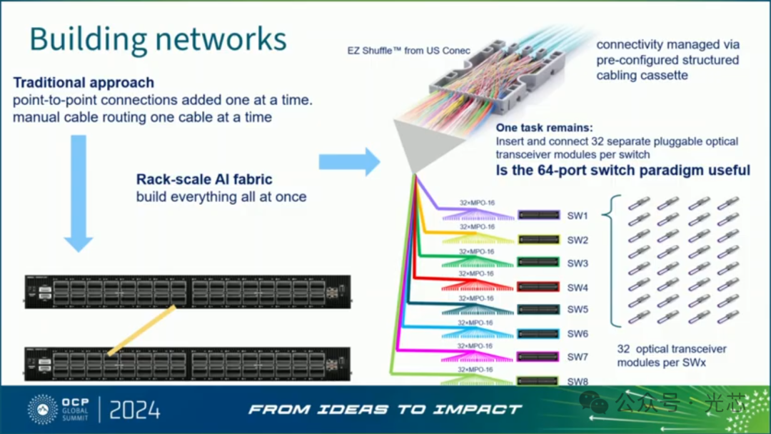 但是,当部署好光纤线束之后,就会发现在Switch侧还需要连接32个可插拔光模块,每个光模块还是MPO16的头。但实际上从客户视角,他们更想要跟前面的光纤连接一样,一个Switch管道就直接配一个32路的光模块。虽然现在也有了多路的CPO引擎,但演讲者认为CPO选择集成在难度最大的ASIC上也不是一个明智的选择,是又一个被行业标准所束缚的产物。