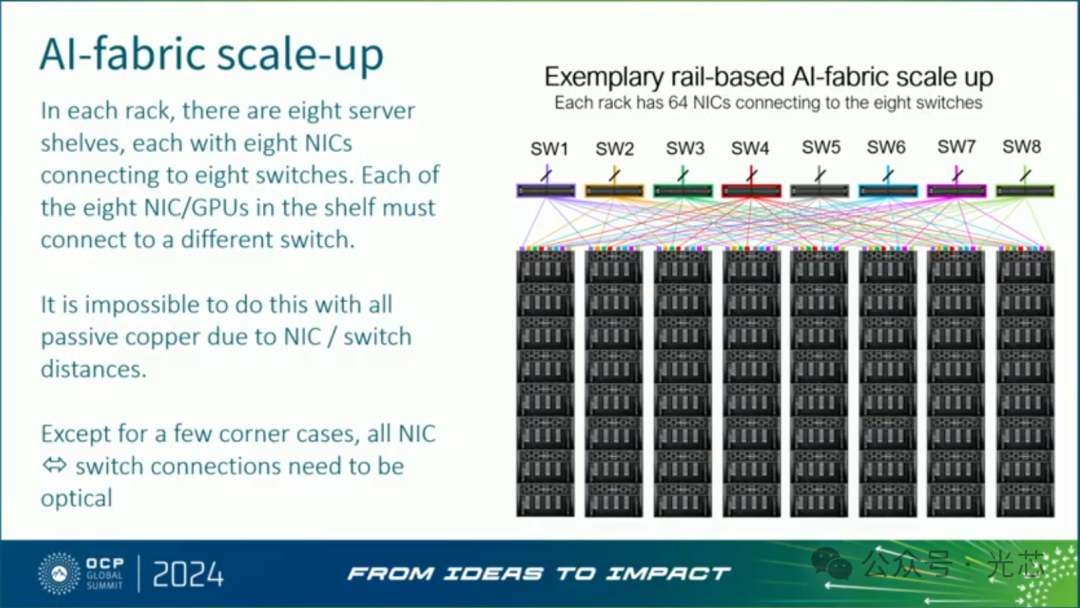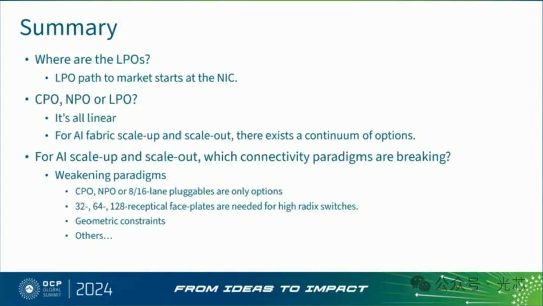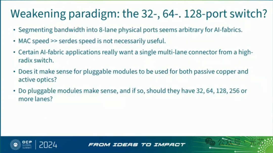 因此,演讲者认为AI时代不应该被以前的标准或者形态给束缚住,而是像Nvidia一样,跳出传统思维,根据AI数据中心的整体系统需求进行系统级的创新优化。8通道1.6T的可插拔模块作者认为是没有意义的,他更希望还是一个匹配Switch端口数(32/64/128)的接口面板,至于是可插拔还是OBO还是CPO都不重要。像Rack的尺寸等物理约束也不应该作为设计约束,需要跳出这些约束,进行整体系统的优化。