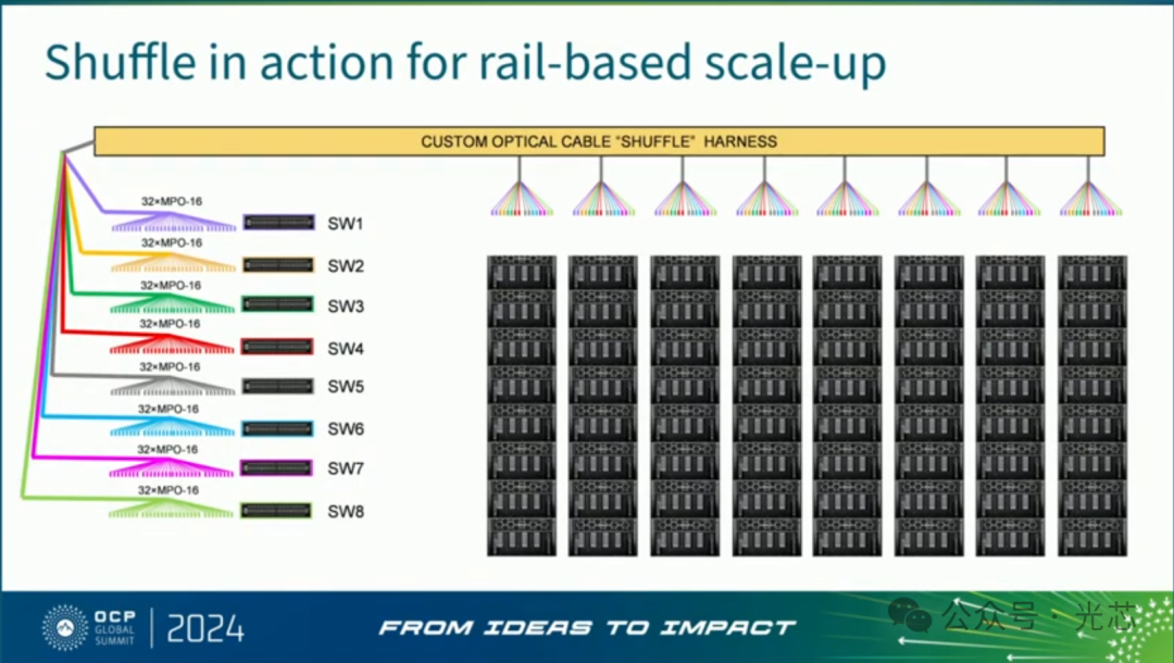 以AI-fabric Scale-up为例,每个Rack里边有8个服务器机架,每个server机架有8个NIC与8个Switch连接,每8个NIC/GPUs要与不同的Switch连接。这么杂乱的连接关系是无法用无源铜缆方案的。而采用光纤互连的方案中,Corning所推出的光纤混排线束Shuffle就解决了这个痛点,可以实现一次完成整网的搭建而非传统的点对点手动连接。这就是一个从系统需求出发促进系统优化的例子。