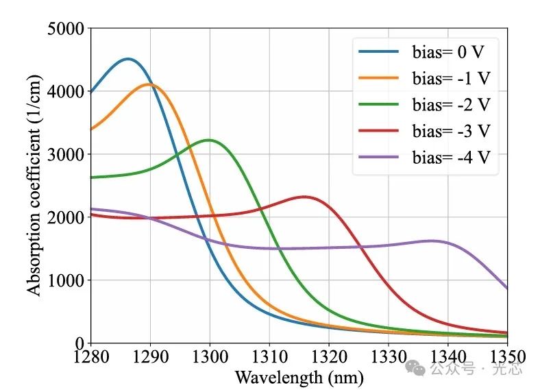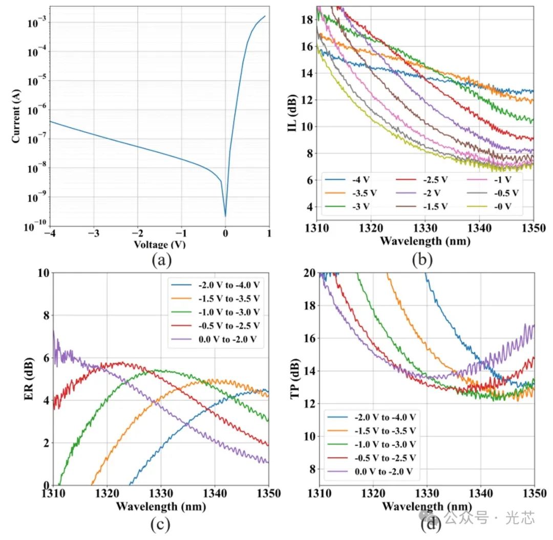 图4(b)呈现了在25℃下,对于TE偏振光,输入光功率为 -1dBm,偏压从0V到 -4V以0.5V步长变化时,从1310nm到1350nm波长范围内测量到的插损IL。IL主要包含两部分贡献:一是硅波导与锗硅波导之间的耦合损耗CL,二是沿器件长度方向的传播损耗PL。