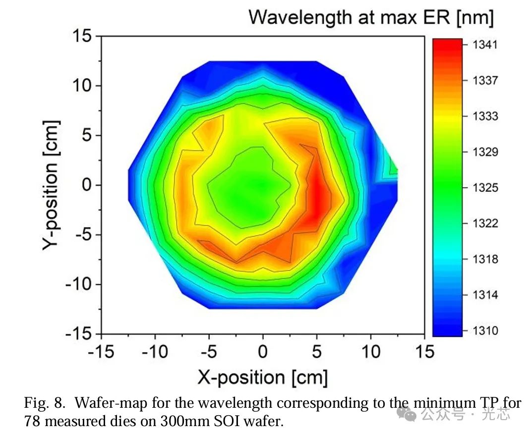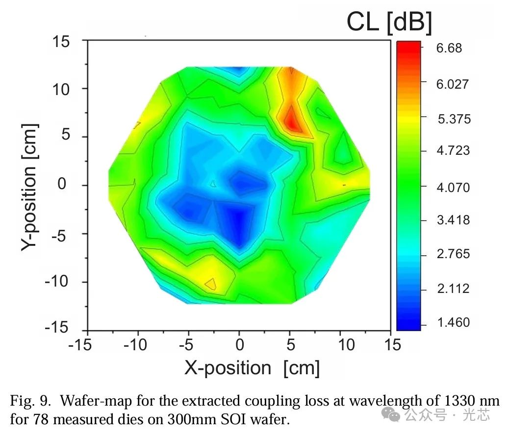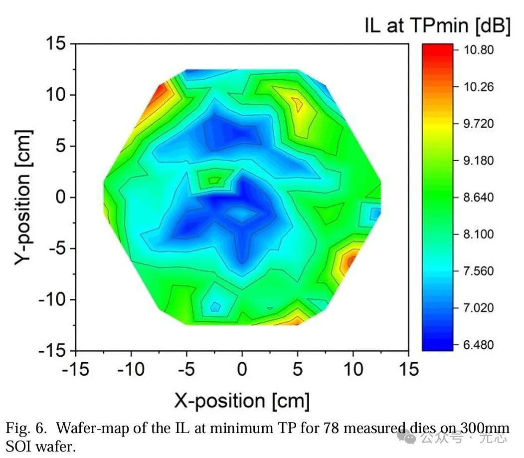 图6展示了测量的IL的晶圆图,中位数为7.9dB,标准差为0.98dB。最低IL值在晶圆中心测量到,与具有最低TPmin的芯片位置重合。