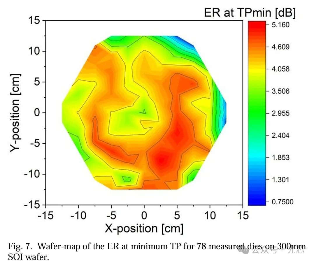 图7展示了在2Vpp(在 -1V和 -3V之间)下与TPmin相对应的ER的晶圆图。ER的中位数为4.13dB,标准差为0.89dB。低ER值位于晶圆边缘,与高TPmin的位置相同。因此,晶圆边缘芯片测量到的高TPmin值是由于这些器件的ER有限所致。