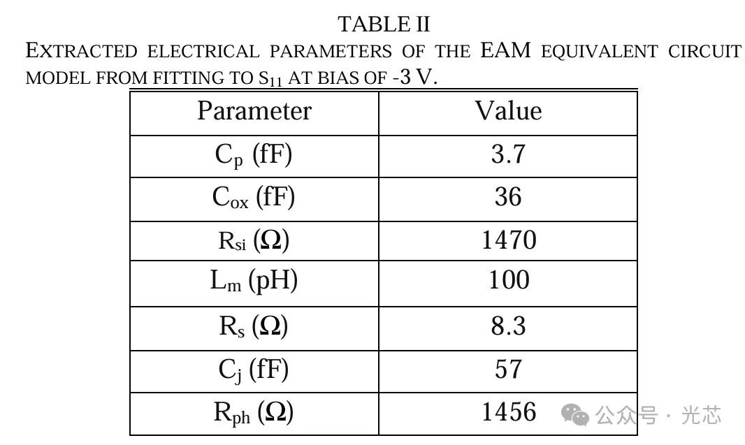 为了更深入地了解器件性能,考通过对器件进行单独的S11测量,提取出焊盘的参数,并在器件拟合过程中固定其值,从而从器件中去除焊盘的影响。核心器件的参数如下表,由四个部分组成:(1)金属线阻抗Lm;(2)器件的串联电阻Rs,它考虑了不同器件层的电阻以及电极处的欧姆接触电阻;(3)器件的结电容Cj;(4)由于本征区内的光吸收而在器件中产生的光电流。光电流表示为一个电流路径,其阻抗可以用与结电容并联的电阻(Rph)来表示。