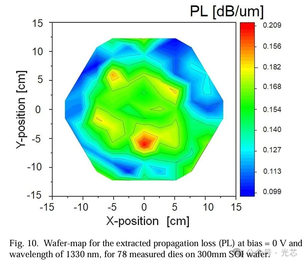 为了分析调制器的IL,将其分解为耦合损耗CL和传输损耗PL两部分。图9展示了在波长为1330nm时提取的耦合损耗的晶圆图,中位数约为4dB,标准差为1.19dB。低CL(<2dB)的芯片位于晶圆中心。图10展示了在1330nm时传输损耗的晶圆图,中位数为0.15dB/μm,标准差为0.02dB/μm。PL是如前文所述多种因素共同作用的结果。