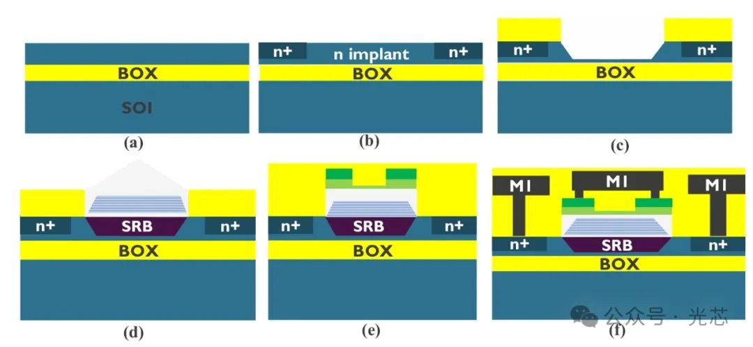 1. 衬底掺杂和平坦化 - SOI晶圆进行磷离子(P)注入形成n型掺杂的底部接触层。 - 沉积二氧化硅(SiO₂)并进行平坦化处理,之后通过湿法蚀刻在硅波导中制造出腔体结构。该腔体作为后续外延生长各类功能层的“容器”,其精准成型对各功能层的生长质量、位置精度以及最终器件性能有决定性影响,比如合适的腔体尺寸能保障外延层厚度均匀、避免边缘效应等问题。 2. 外延生长与处理 - 晶圆经清洗后被置入ASM Intrepid™化学气相沉积(CVD)反应器中。先是在850°C进行短暂的外延生长前烘烤,优化晶圆表面状态,提升后续外延层生长质量,减少缺陷生成概率。 - 随后利用RPCVD技术与常规Ge和Si前驱体,选择性地在硅波导腔体内生长不同外延层。按顺序先是生长170nm厚、n型掺杂的Si₀.₁₅Ge₀.₈₅ SRB层(以PH₃作为掺杂源),生长后进行退火处理,降低线位错密度,减少晶格缺陷,提升晶体质量。 - 接着生长20nm厚的本征Si₀.₁₅Ge₀.₈₅底部间隔层,起到隔离缓冲作用,隔开SRB层与后续MQW结构,避免不同层间不良相互作用影响MQW性能;之后生长MQW结构,严格把控各量子阱与势垒的厚度、成分,保证整个外延结构应变协调稳定,防止因应变积累导致的材料开裂、性能劣化等问题。 - 再生长60nm厚本征Si₀.₁₅Ge₀.₈₅作为顶部间隔层,并且特意控制生长时间使其过量生长,确保能完全填充腔体,维持结构完整性与平整度,为后续工艺步骤提供良好基础。 3. 表面平整与p掺层生长: - 利用化学机械抛光(CMP)工艺将顶部表面处理至与周边氧化物平齐,保证表面平整度,利于后续光刻、沉积等工艺操作,减少因表面起伏导致的工艺误差与器件性能偏差。 - 450℃低温生长p型掺杂的Si₀.₅₀Ge₀.₅₀双层(FCL + TCL,场限制层 + 顶部接触层),且在工艺流后续阶段对TCL在腔体中心区域进行蚀刻处理,调整其结构与电学光学特性,减少光损耗等。 4. 电极加工