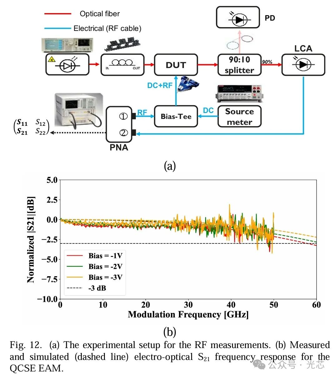 在工作波长为1320nm、输入光功率为1dBm时,不同反向偏压水平下的典型S21电光频率响应如下图,QCSE EAM的3dB带宽大于50GHz。在反向偏压下,PIN结的本征区厚度因耗尽而增加,较大的本征区会产生较小的结电容,因此随着偏压的升高,器件的速度会增加,这在图12(b)中可以明显看出。