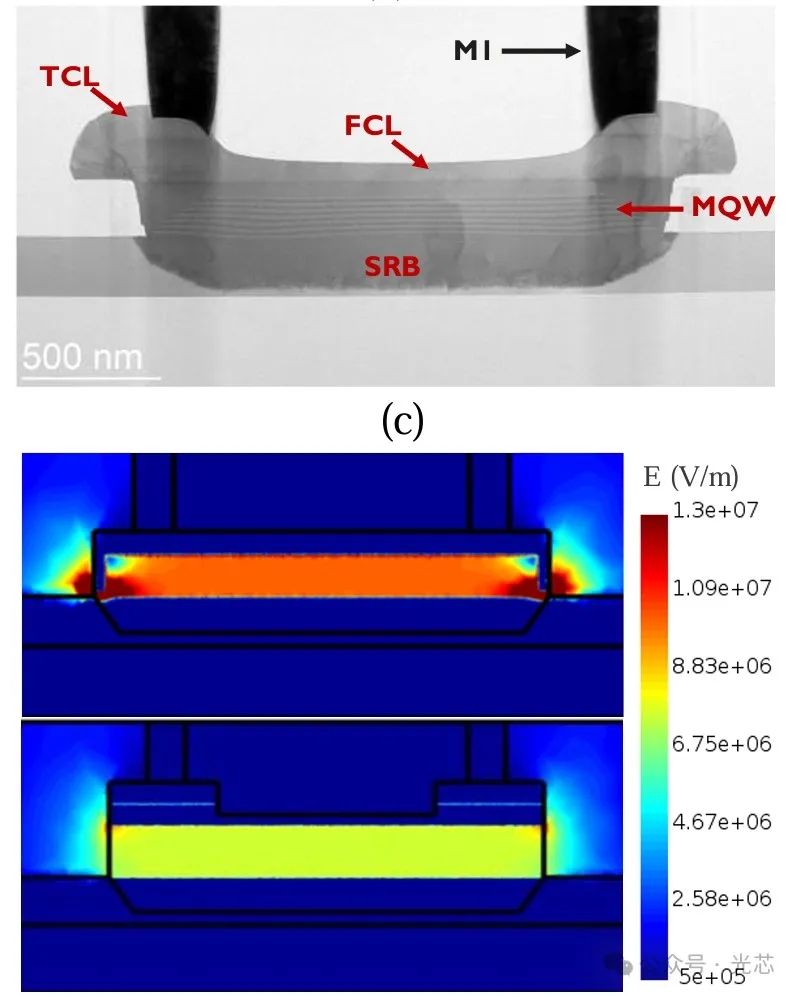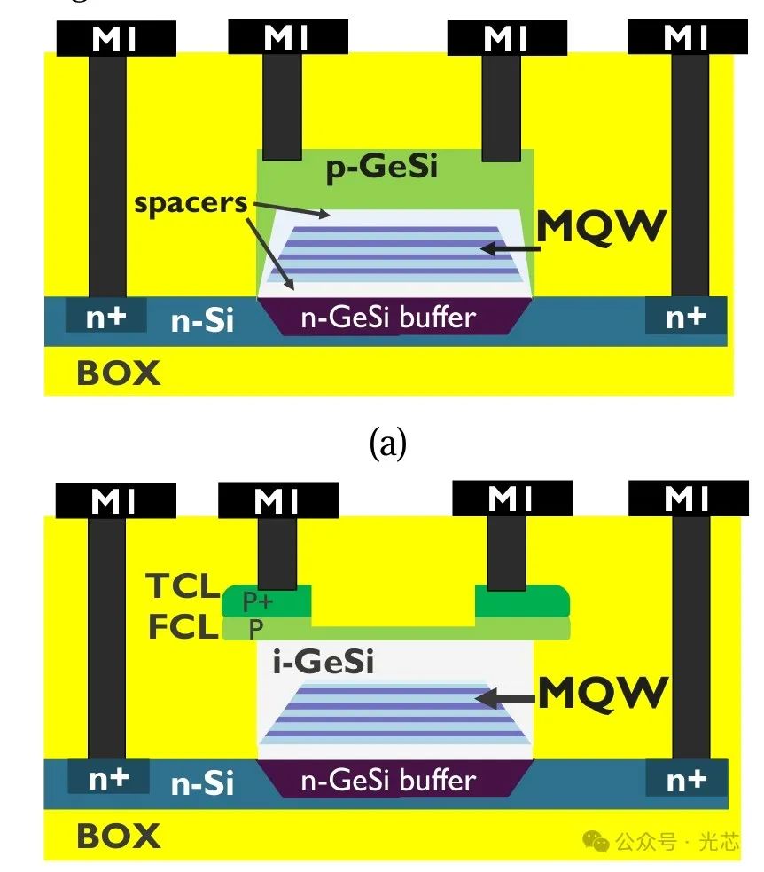 ◆ 器件结构设计 这个文章采用的QCSE EAMs采用垂直p - i - n二极管结构,这种结构是为了有效地实现对光信号的调制。其中,器件的顶部和应变弛豫缓冲层分别作为二极管的p区和n区,它们的作用是形成一个电场,并且将这个电场限制在由MQW(多量子阱)构成的本征区内。薄间隔层则起到了将本征区与掺杂区隔离开的作用,这有助于控制载流子的运动和电场的分布,从而实现对光吸收的调制。相比他们之前的结构(图a),新的结构设计(图b)做了几点优化和改进: