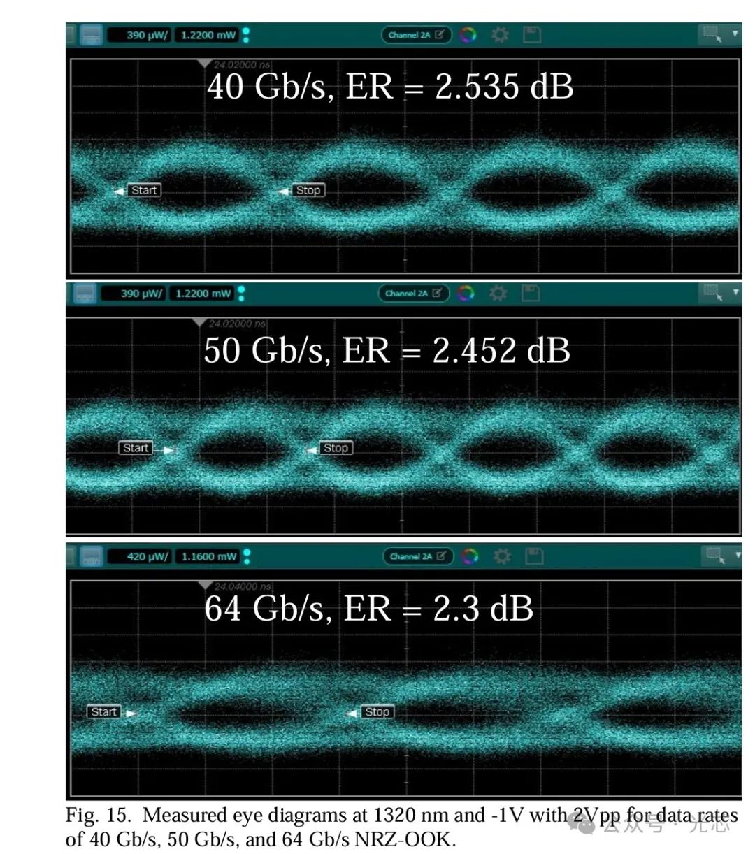 图15展示了器件的大信号调制性能。在1320nm波长、输入光功率为0dBm和偏压为 -1V的条件下,测量得到了在40Gb/s、50Gb/s和64Gb/s时的眼图,动态消光比分别为2.535dB、2.452dB和2.3dB(2Vpp)。