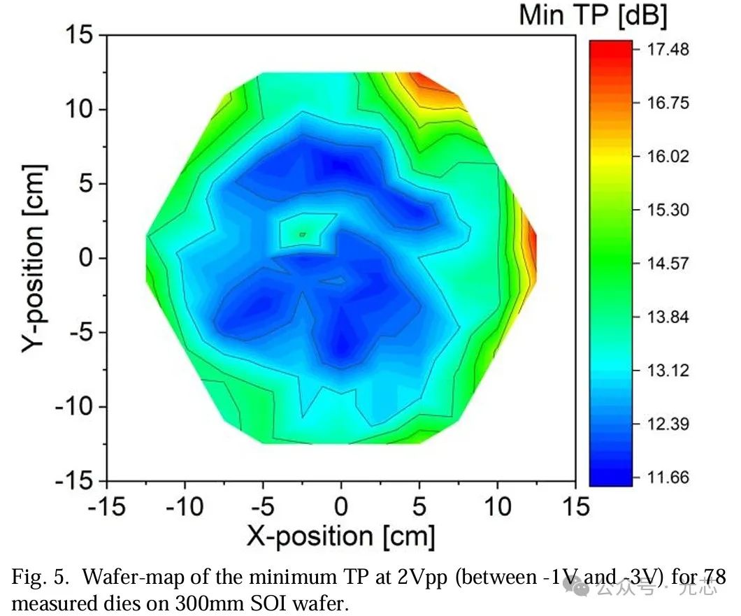 对300mm晶圆上的78个芯片进行了测量,图5展示了在2Vpp(在 -1V和 -3V之间)下提取的TPmin的晶圆图。TPmin的中位数为13.1dB,标准差为1.31dB。TPmin的最佳值大多位于晶圆中心,最差值位于晶圆边缘。