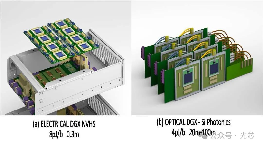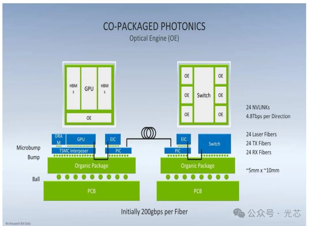 最后再放Nvidia在另外一个报告的两张有意思的图,NV的论文对这两张图没做解释。但是看上去满眼都是Lightmatter、Celestial AI和Ayar Labs的影子,也标出了TSMC interposer。上边很多内容都是想象能力范围内猜的,猜错了请谅解,看看有没有更专业的老师出来解读分析一下。