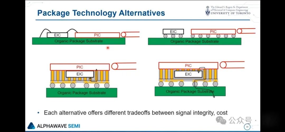 为了进行协同设计,要调整的合适的参数以及协同设计的方式取决于所使用的封装技术,也就是要怎么把这些我们称之为小芯片的部件放在同一个封装上呢?可以用引线键合的方式连接它们,一些现有的用于可插拔模块的共封装光学器件就是这么实现的;也可以采用倒装芯片的方式,把它们倒装到一个公共基板上,这时就要依靠封装基板里嵌入的布线来完成连接工作;还可以开始堆叠这些部件,有不同的堆叠方式,可以一个叠在另一个上面,或者让互联线路有不同的走向,这取决于构建的方式,而且每种方式在信号完整性和成本方面都会有不同的权衡取舍,而且不管采用哪种方式,都有一个不容小觑的挑战,那就是要以低损耗的方式准确地将光纤与光子学器件耦合在一起。