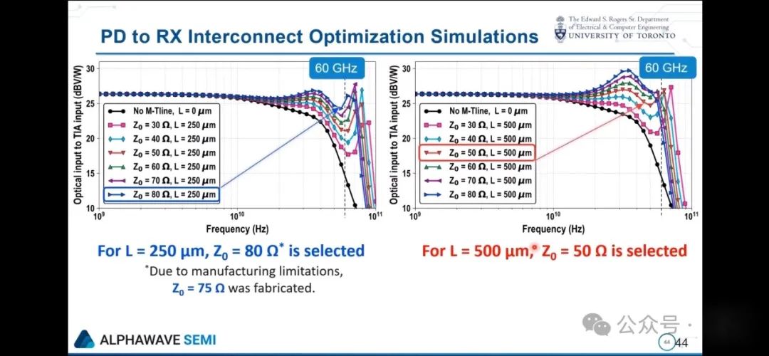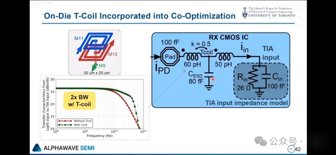 让我稍微跳跃一下内容,我想重点介绍一个我在多伦多大学参与的项目。本质上,这个项目的目标是对封装和光接收器前端的放大器进行协同设计,以便在给定一个商用PD的情况下实现最佳的整体性能。这里有很有意思的优化机会,对于封装基板里使用的互联线路,它应该是细长的还是粗短的,这并不是显而易见的,每种方式都有优缺点,实际上在这种互联线路的形状和芯片上嵌入的模拟前端电路之间是可以进行协同优化的,通过对整个系统进行协同设计,可以在整体性能上实现显著的提升。这让我们开始考虑一个优化框架,这个框架涉及到利用机器学习来帮助我们高效地完成这种复杂的优化工作。我觉得在这方面还有很多工作要做,但大家可以看到这样做能带来的好处,这些是展示用给定的模拟前端设计来改变不同类型互联线路的扫描图,大家可以看到通过合理地协同设计这些部件,带宽能有两倍甚至更多的显著提升。而且看看这个图也挺有意思的,这就是把所有部件组合在一起的样子,这里有一个 CMOS 芯片,在这个例子里它被倒装在封装基板上,有一组光电二极管也倒装在旁边,间隔只有很小的几百微米,它们之间相互连接,跨阻放大器位于这里,这里有一个,不同的光电二极管对应不同的TIA,而且这些是背照式的。图中展示了原型,有光电二极管和 CMOS 放大器芯片,光纤从上方接入,然后在封装顶部测量电输出信号。