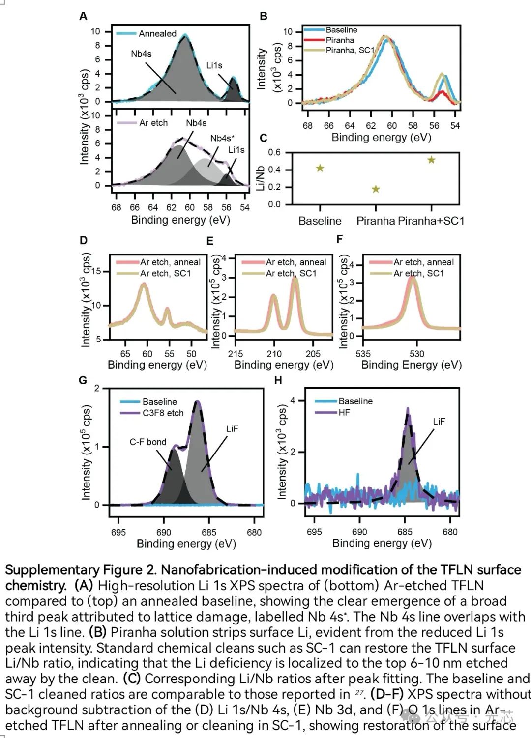 - 后清洗工艺:SC-1清洗(NH₄OH:H₂O₂:H₂O=1:1:5)可去除刻蚀副产物,恢复表面Li/Nb化学计量比(补充图2c),但过度清洗(>10分钟)会重新引入Li空位缺陷。