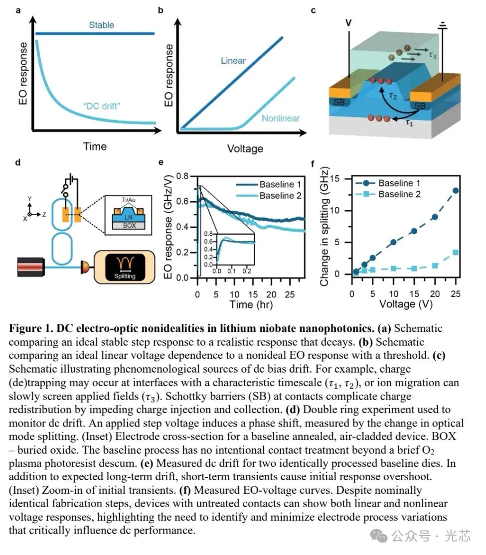 薄膜铌酸锂极大推动了集成光子学的发展。然而,不过它的直流电光不稳定性(如漂移DC Drift、阈值效应)也成为制约高精度应用的核心问题。近期,哈佛大学团队发表研究,系统揭示了界面效应(金属-LN接触界面和氧化物-LN包层界面)对TFLN器件性能的主导作用,并提出工艺优化方案。