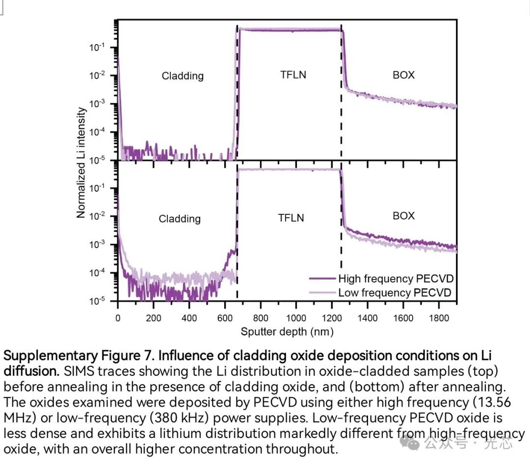 对比了高频(13.56 MHz)与低频(380 kHz)PECVD SiO₂(补充图7)。低频SiO₂密度较低(~2.0 g/cm³ vs. 2.2 g/cm³),孔隙率更高,导致Li⁺扩散速率加快。低频PECVD SiO₂的Li扩散深度比高频工艺高40%。未来可采用高密度包层(如Al₂O₃,密度3.9 g/cm³)抑制Li迁移。