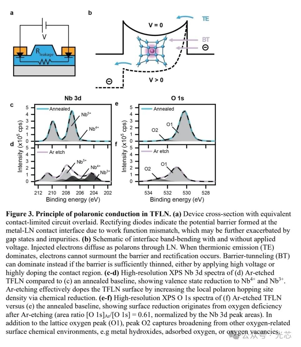 铌酸锂的亚稳态缺陷(如NbLi⁴⁺反位缺陷、氧原子空位)是电荷载流子的主要来源。根据Schirmer等人的经典研究,LN中电子通过small polarons形式传导:电子局域于Nb⁴⁺位点,通过热激活跃迁至邻近Nb⁵⁺位(图1c)。这种传导机制迁移率极低(~10⁻⁴ cm²/V·s),且受缺陷浓度强烈影响。通过XPS证实,等离子体刻蚀后表面Nb³⁺/Nb⁴⁺比例升高(图3c-d),形成更多极化子跃迁位点,从而降低接触势垒。