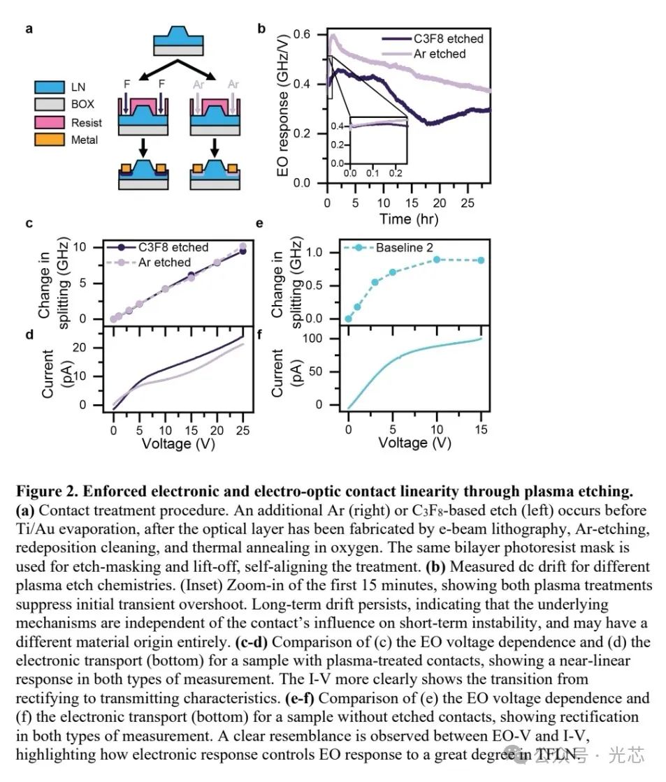 一般来说,表面化学和界面效应对器件性能的影响,尤其是对可靠的电光性能的影响,会随着材料尺寸的减小和表面 - 体积比的增加而加剧。本工作深入理解了在TFLN纳米光子器件中实现稳定和线性电光操作的界面条件。虽然通常认为热退火可以提高器件性能,但本工作发现,TFLN电光器件必须经过精心设计,以防止锂扩散到包层中,就像硅光Foundry也会防止掺杂剂扩散一样。此外,接触界面的微小改变会极大地影响直流响应的演变,这突出了全面了解TFLN的电子特性(而不仅仅将其视为理想的无缺陷电介质)的重要性。为此,本工作利用LN中传导的极化子特性,开发了一种化学还原方案,尽管存在蚀刻损伤,但仍能提升接触线性度。接触工程在集成电路和硅光子学中已得到充分理解,但在不明确依赖载流子注入进行折射率调制的电光器件中却很少使用。