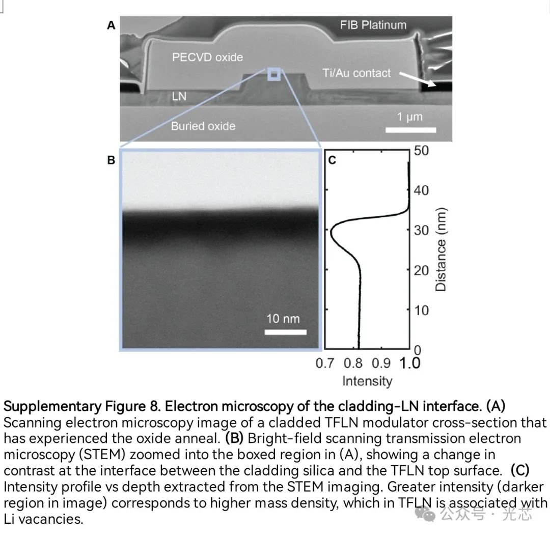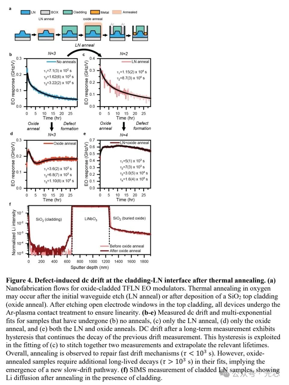 LN中的Li⁺离子在高温(>200℃)下发生迁移。通过SIMS发现,SiO₂包层退火后界面Li浓度增加30%(图4f),这与Nagata等人报道的Li⁺向外扩散现象一致。Li原子空位作为受主缺陷,可捕获极化子形成深能级陷阱,导致慢速电荷弛豫(τ₃ ~10⁴ s)。STEM显示退火后界面区域密度增加(补充图8c),可能是NbLi⁴⁺缺陷聚集所致,进一步加剧局域电场畸变。