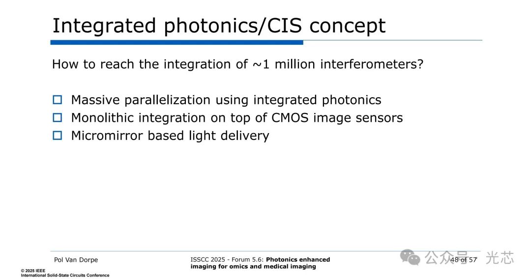 目前研究的重点在于如何实现约100万个干涉仪的集成,这需要借助集成光子学实现大规模并行化,并将其单片集成在CMOS图像传感器上,同时利用微镜进行光传输。