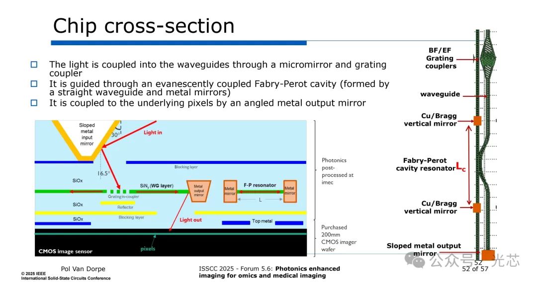 ③光信号采集: 干涉信号最终由倾斜金属反射镜耦合至下方像素。