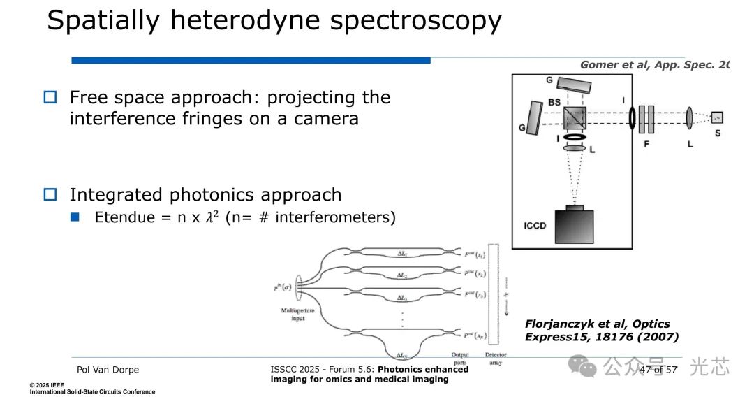 为解决上述问题,空间外差光谱技术(傅里叶变换光谱仪)应运而生。该技术有两种实现方式,一种是自由空间方法,将干涉条纹投射到相机上,另一种是集成光子学方法,其光学扩展量为n×λ²(n为干涉仪数量)。