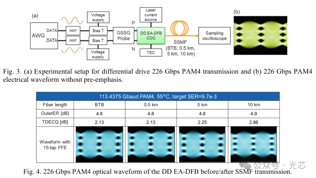 本文提出的差分驱动 EA-DFB 激光器通过芯片级电隔离设计,首次实现了 226 Gbps PAM4 调制下 10 km SSMF 的稳定传输,且封装兼容现有 SE EA-DFB 技术。该方案为 1.6 TbE 光模块提供了低功耗、长距离的解决方案,未来可进一步优化预加重算法和光器件带宽,以支持更高速率的 PAM4 或 PAM8 调制。