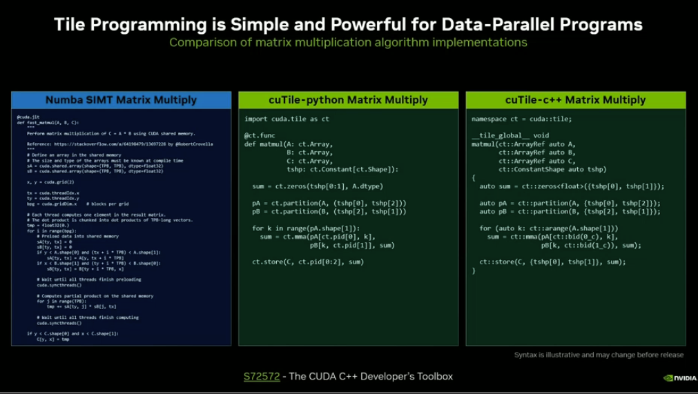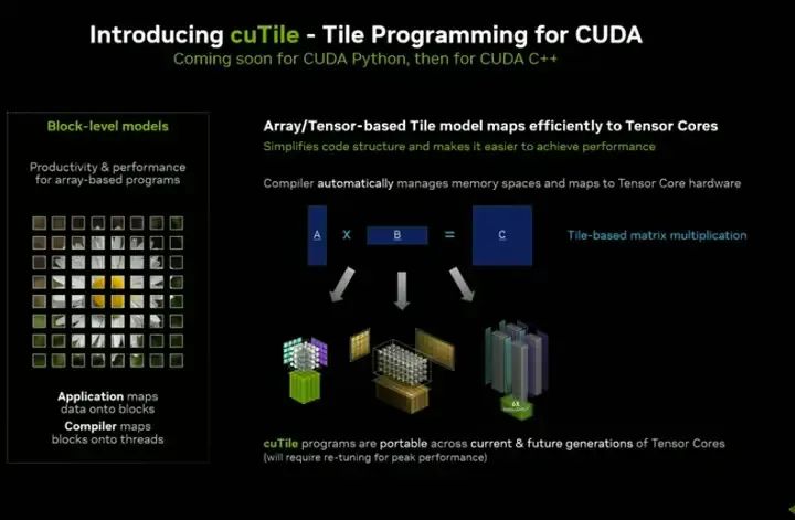 由于cuTile已深度集成到CUDA平台(作为Cuda的基础扩展),所有代码可移植性和跨代兼容性保障都自动生效。这意味着用张量表达的算法可以运行在任何架构上,无论底层硬件如何演进。