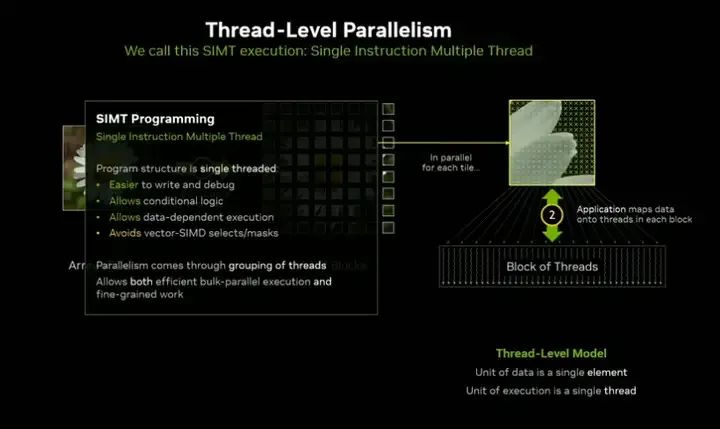 在我看来,这正是GPU的真正超能力,也是它与传统的SIMD向量计算架构的主要区别。我们称之为单线程执行模型的结构,当它们被组合使用时,就能产生强大的并行能力,但你又不必完全依赖这种组合。你仍然可以控制细粒度的并行,这种灵活性使得GPU能够适用于极其广泛的应用场景。