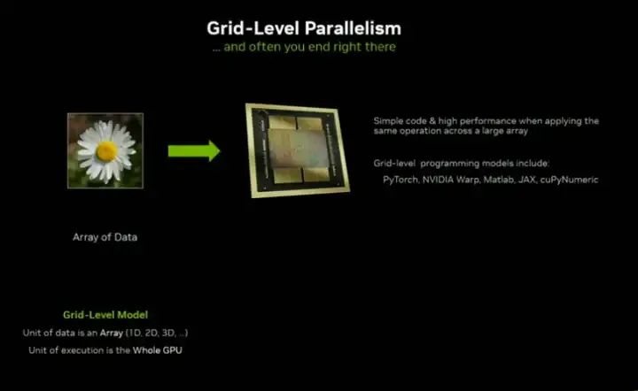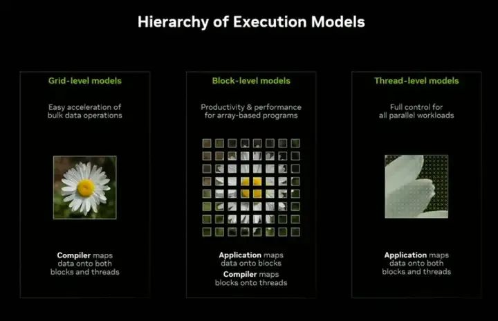 我们拥有三种不同层次的并行模型:左边的网格级模型,右边的传统线程级模型,中间的块级模型(这正是我想重点介绍的)
