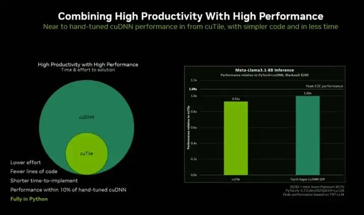 左边是从网上找的NumPy矩阵乘法示例,使用共享内存等底层线程级操作。右边的代码显然更易读,逻辑更清晰,性能却完全相同。开发者无需深入线程细节,只需关注数据分块策略,编译器会自动处理并行化和内存优化。