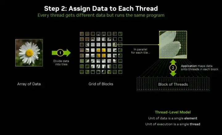 CUDA的分解方式是这样的:你把程序拆分成独立的模块。这在多核或多节点开发中同样适用——你需要找到可以并行处理的独立工作单元。对于Cuda来说,你要做的是启动一个网格(grid)的线程块(block)到GPU上,处理这些被我称为"数据块"的问题单元。每个线程块会处理一个或多个数据块,而每个线程块内部最多可以有1000个线程。每个线程会挑选一个数据元素进行处理,通过这种线程协作的方式,我们实现了并行计算。在CUDA的GPU架构中,通过将线程组合起来,每个线程执行单个元素的运算,我们既获得了粗粒度的并行,也保留了细粒度的控制。